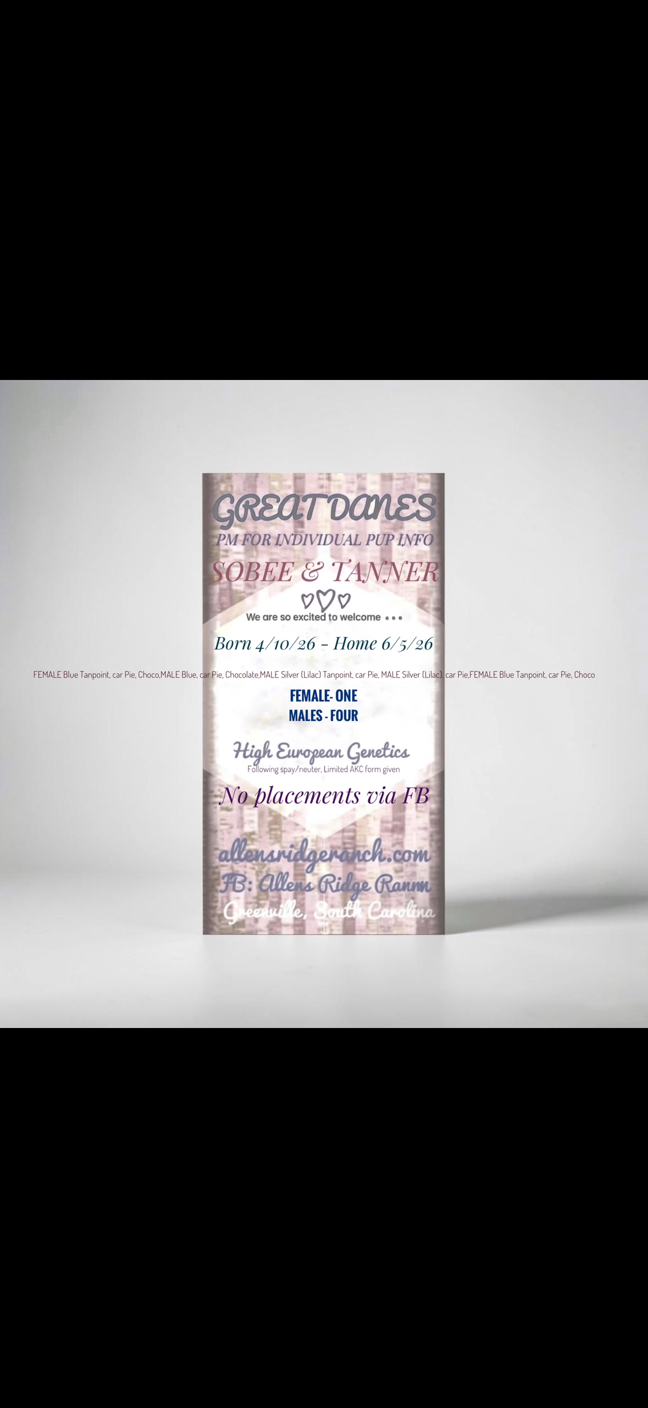 Born 4/10/26. He will be on a neuter contract with pet AKC when completed. Deposit to hold him is 600. Total is 2700 which is due at pickup around June 5, 2026, at 8 weeks of age. 864-884-6688 Thank you for visiting Allen’s Ridge Ranch!