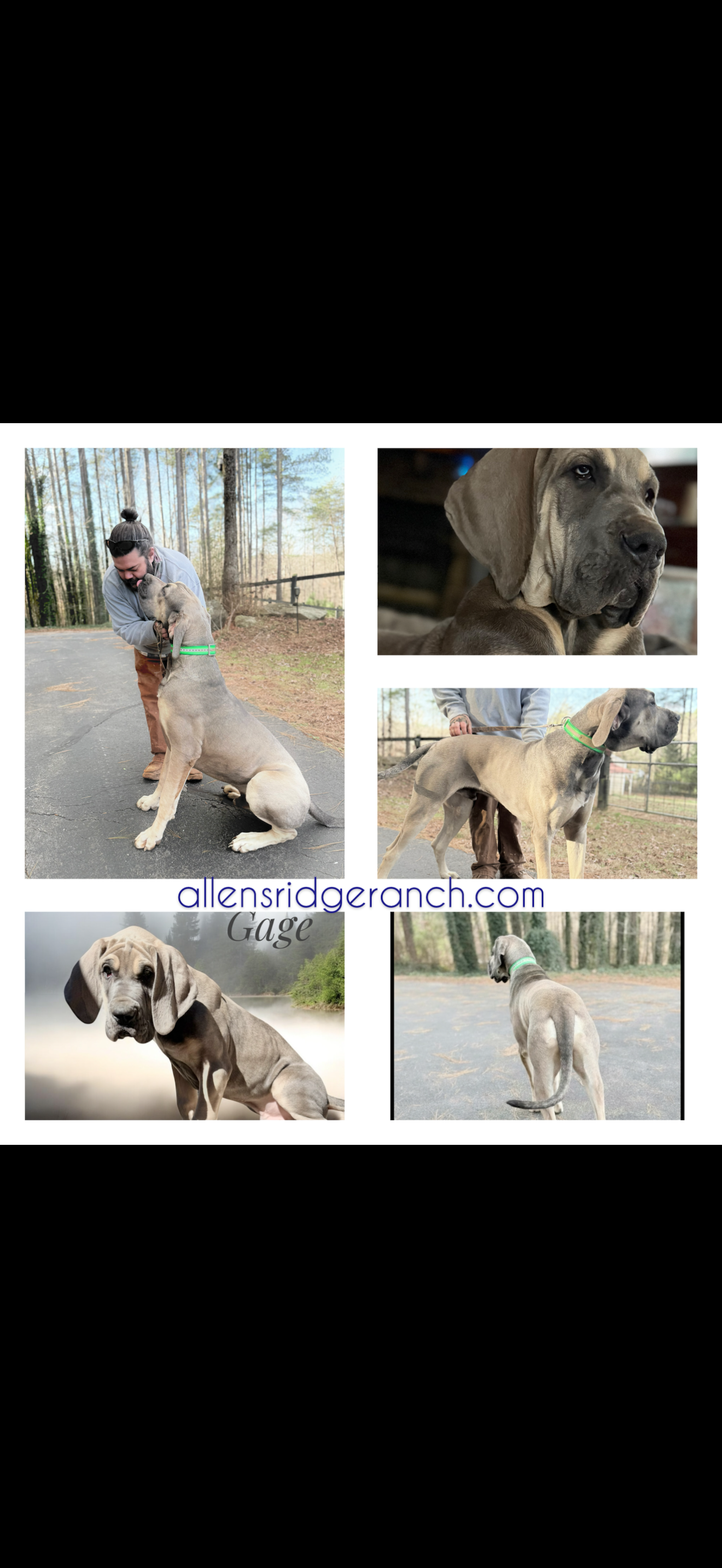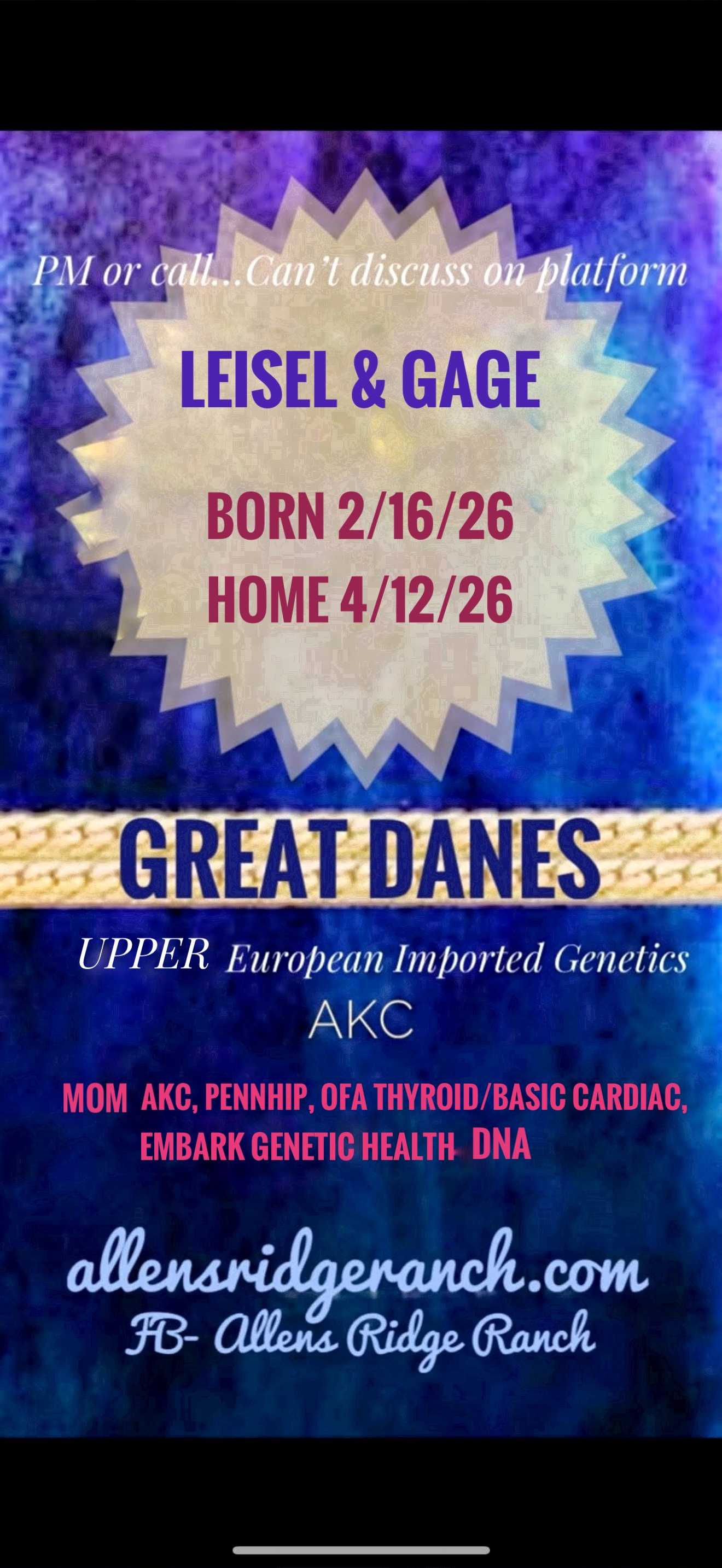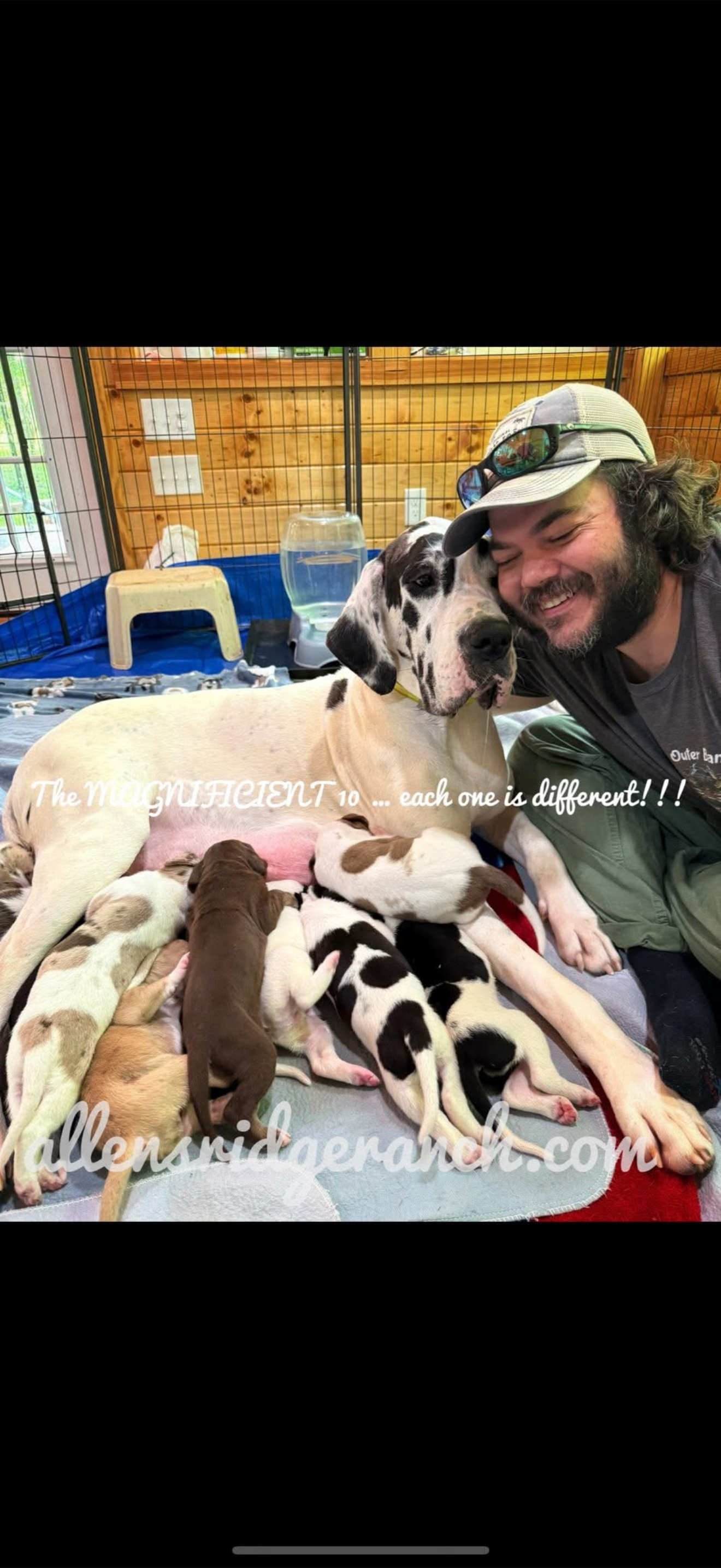 We are so excited for this breeding as it is daddy’s first litter! These pups are looking for AKC PET homes and a couch/lap and the continuation of love that we are teaching them. Puppy application is at bottom of page one of website. We require a FaceTime meeting with all members involved in obtaining a dane baby from Allen’s Ridge Ranch. It is a lifelong serious commitment. Thank you for looking! Susan, Tom ….and Thomas our “Great Dane Whisperer”.