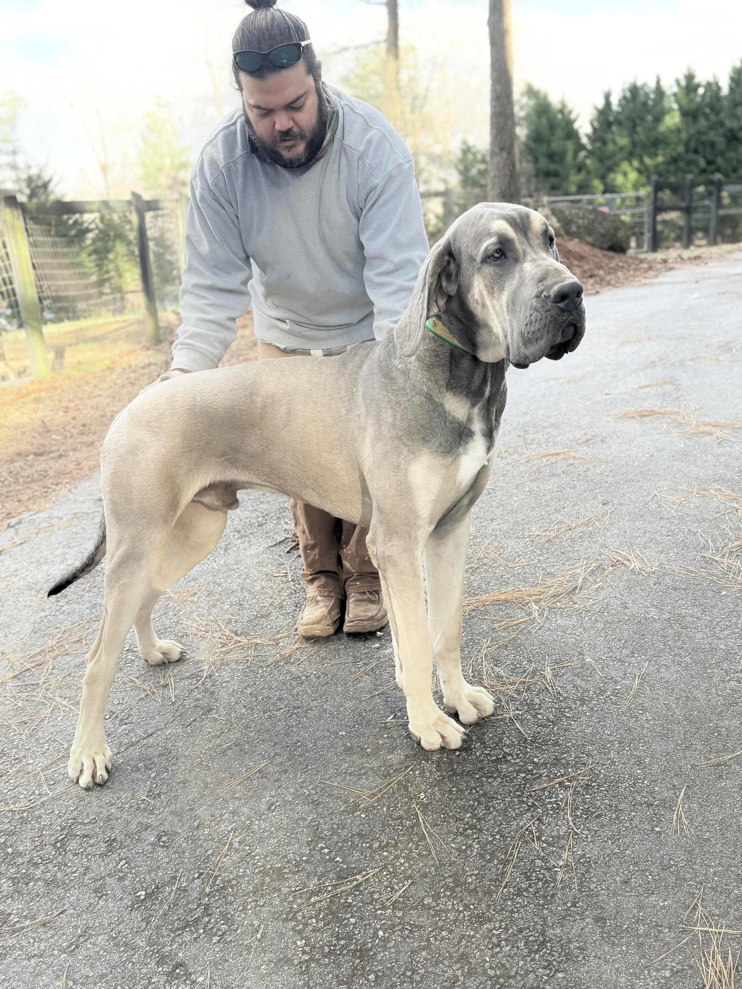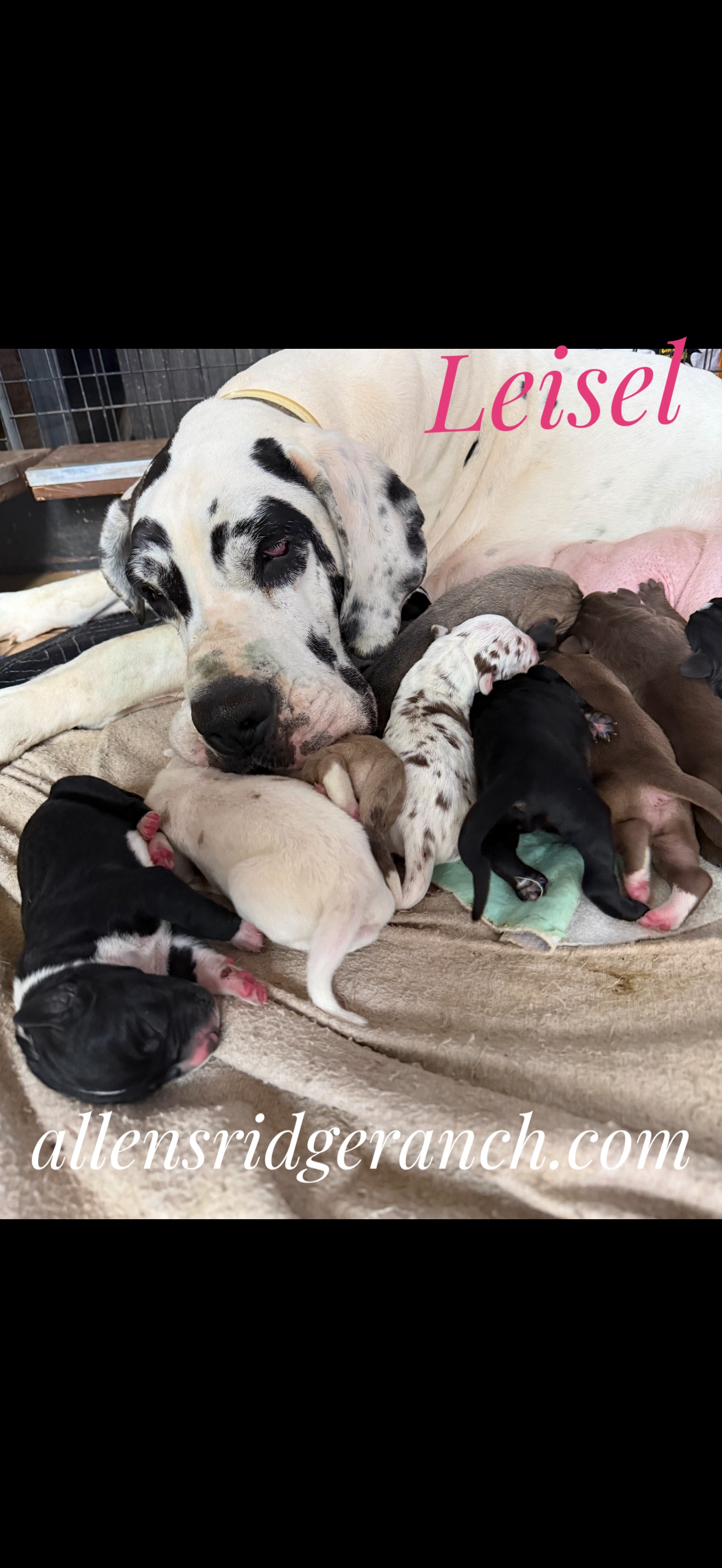 Both parents are loving family oriented Danes who seek to please their loved ones. Mom,a stunning Harlequin PIE, thick structured Great Dane who carries chocolate, mantle , and Tanpoint, the beautiful Leisel. She is a total lap cuddle bunny who loves all she meets! Dad is an absolute stunning large frame Bluefawn, chocolate and tanpoint carrier who is AKC DNA’d. Parents are Embark Genetic, PennHip, OFA Badic Cardiac/Thyroid tested. Mom is 85-90 European genetics and dad is 90 Euro genetics. He is a big ole goofy dane:) with a massive presence. Mom’s previous litters produced magnificent big pups, raised with lots of love and total attention while in our care. They are leash started, potty box and doggy door oriented. Go home bag with leash, collar, momma, and sibling snuggle scent blankie and goodies given. Five way puppy shots and kennel cough prevention vaccines given. Vet checked and cleared. Private transport is available.