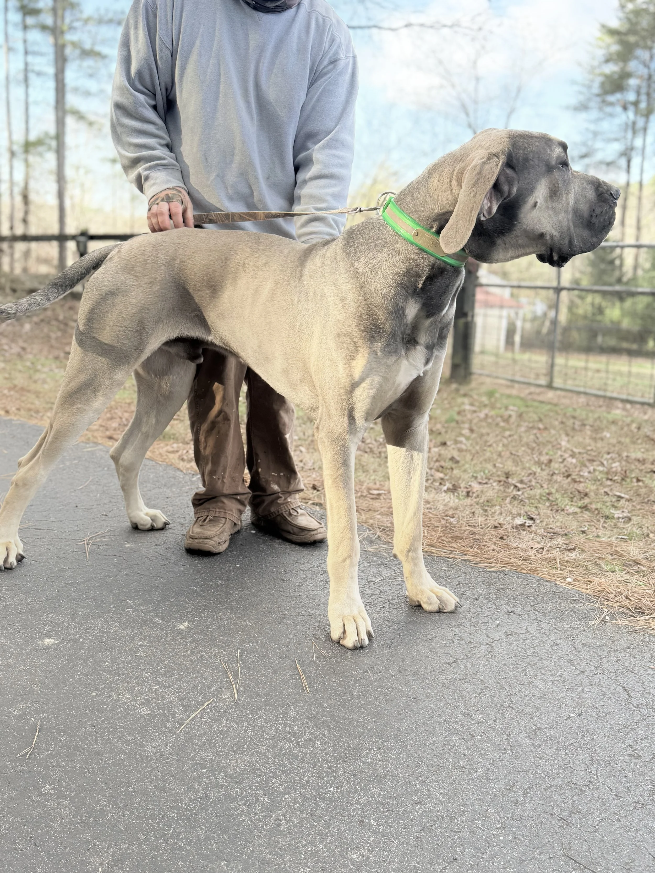 Both parents are loving family oriented danes who seek to please  their loved ones. Mom,a stunning Harlequin PIE, Great Dane who carries chocolate mantle, and  Tanpoint, the beautiful Leisel. She is a total lap cuddle bunny who loves all she meets! Dad is an absolutely amazing massive frame Bluefawn, chocolate and tanpoint carrier who is AKC DNA’d.  Parents are Embark Genetic,  PennHip, OFA Basic Cardiac/Thyroid evaluated. Mom is 85-90 European and dad is 90 Euro. Both big ole goofy danes:) Mom’s previous litters produced magnificent big pups, raised with lots of love! We are so excited for this breeding as it is daddy’s first litter! We can’t wait….